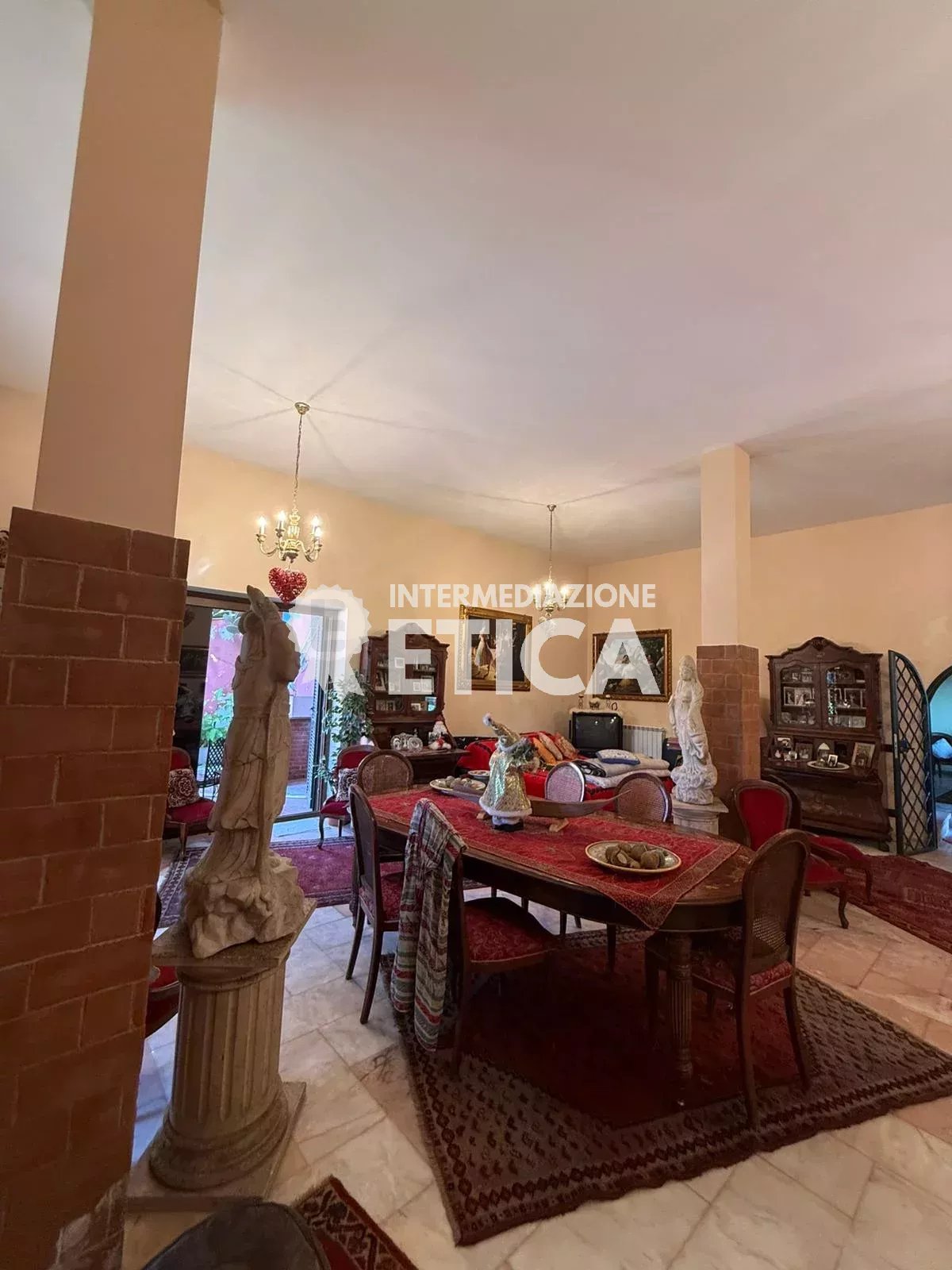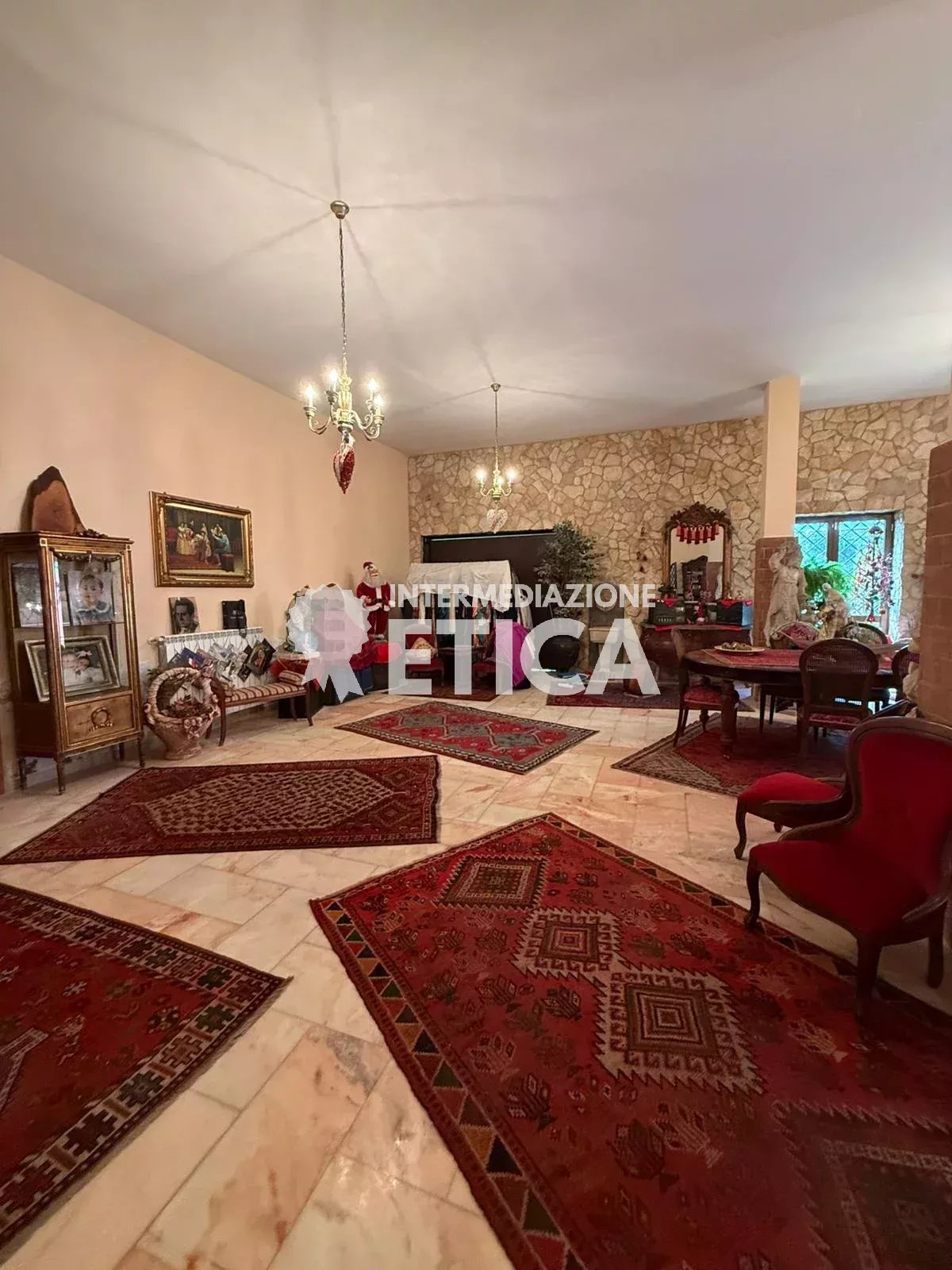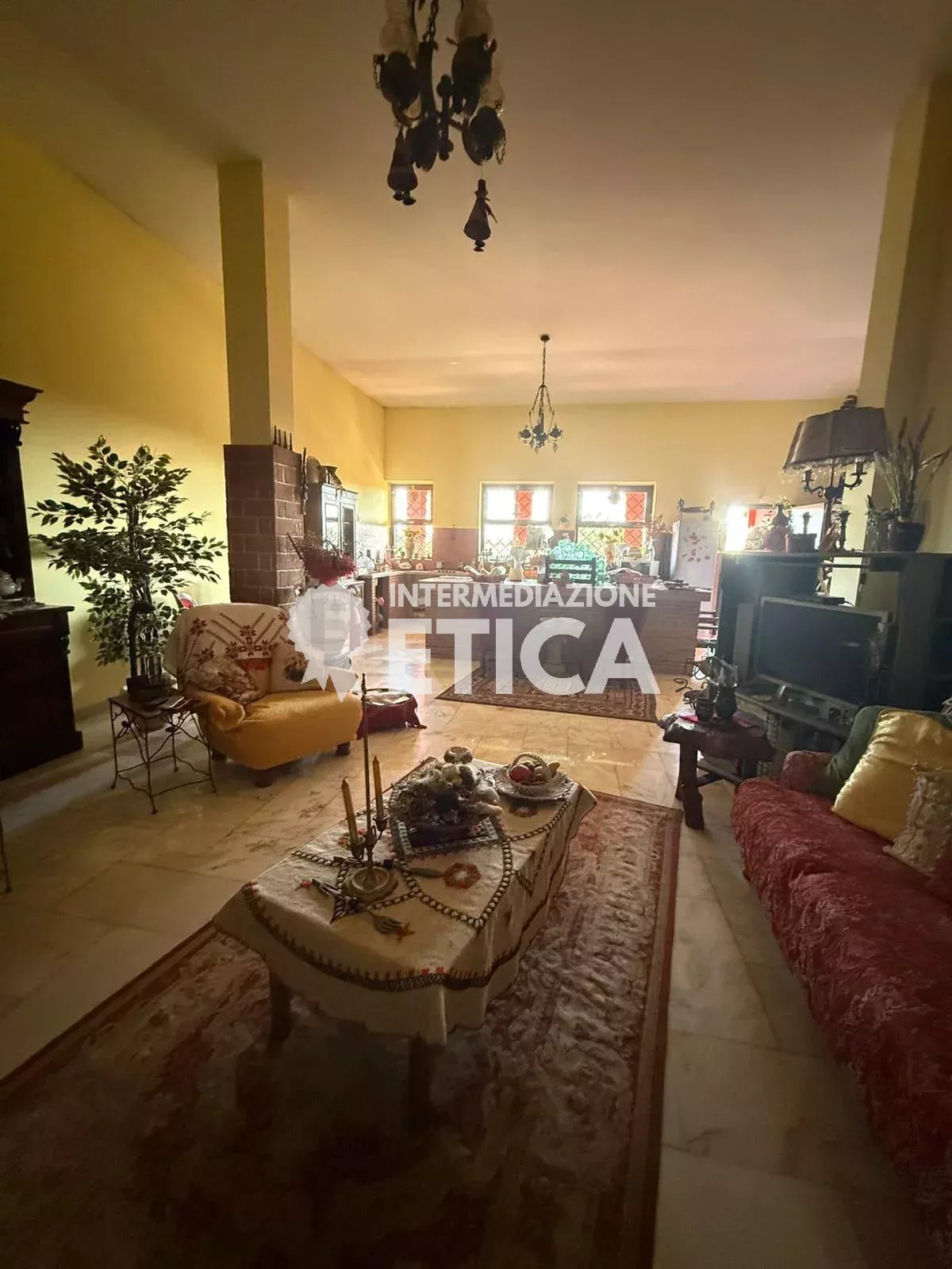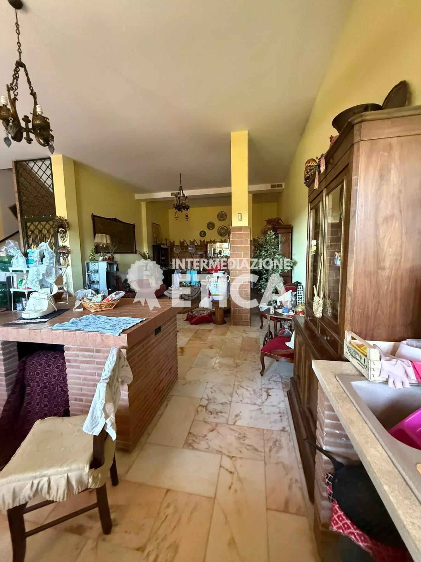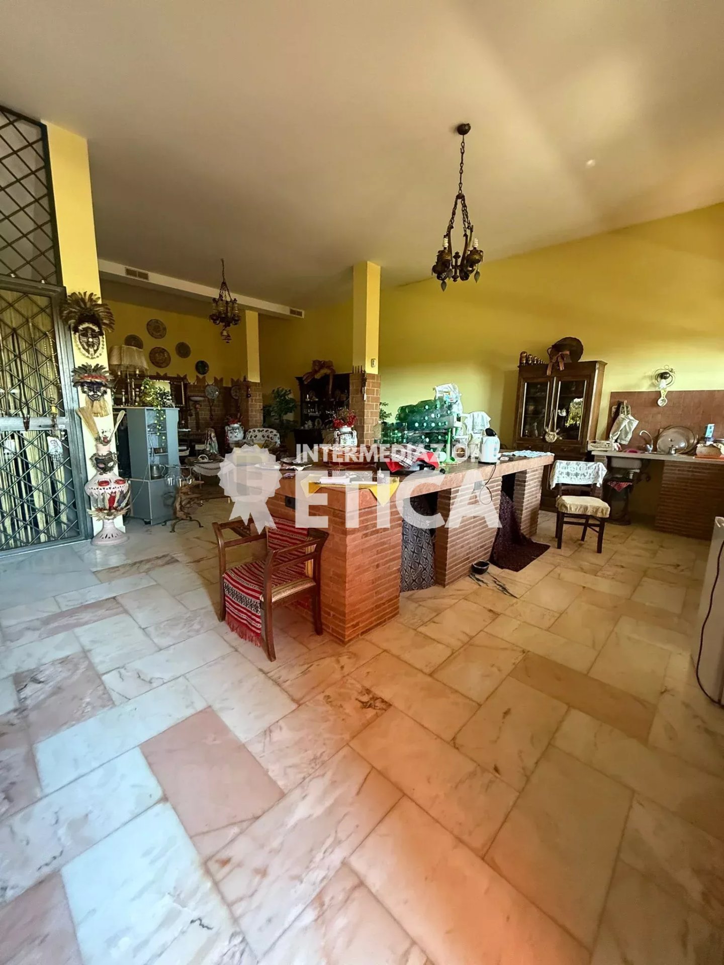 Scendendo le scale, al piano terra, dai soffitti alti, ci accoglie la sala per gli ospiti, con una imponente cucina in muratura, e a seguire, la sala ricevimenti, spaziosa ed eclettica, avendo solo le colonne portanti, darà a chiunque la possibilità di personalizzare gli spazi.