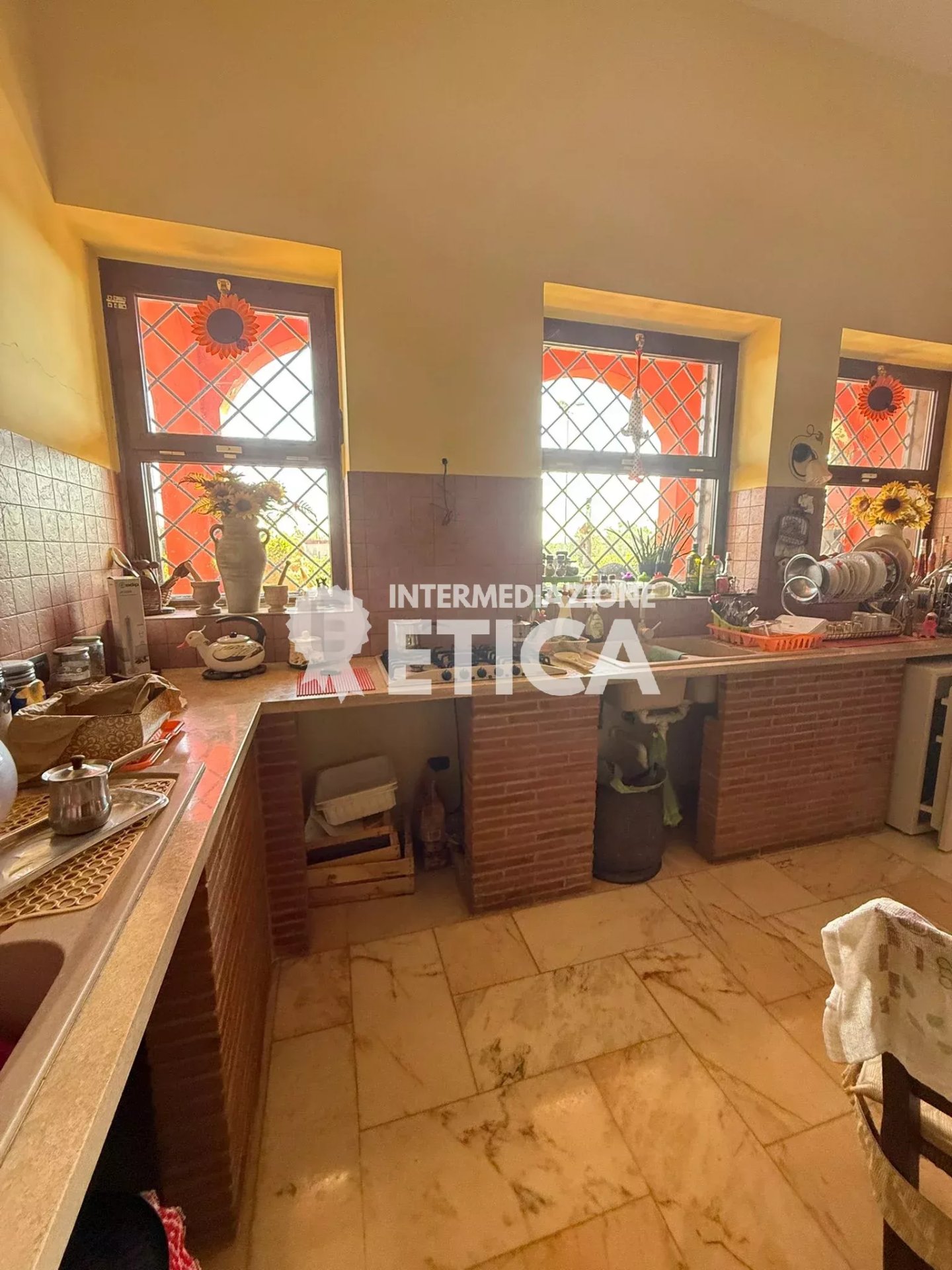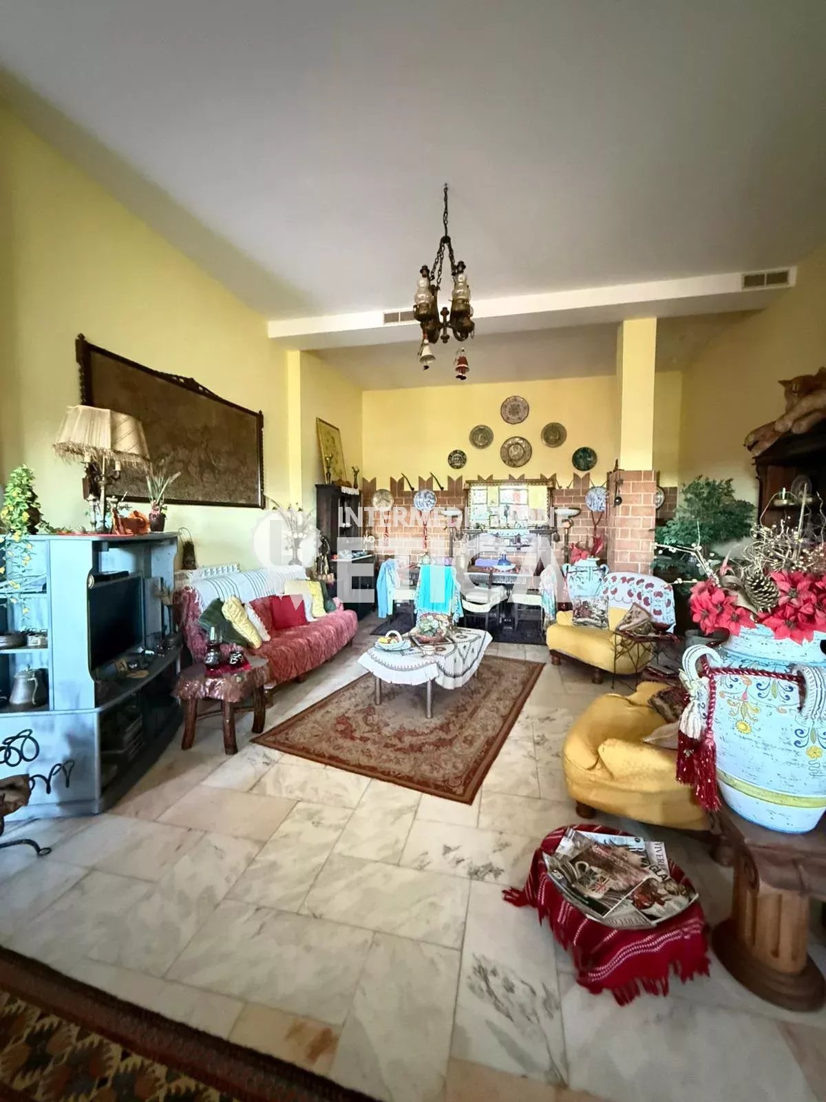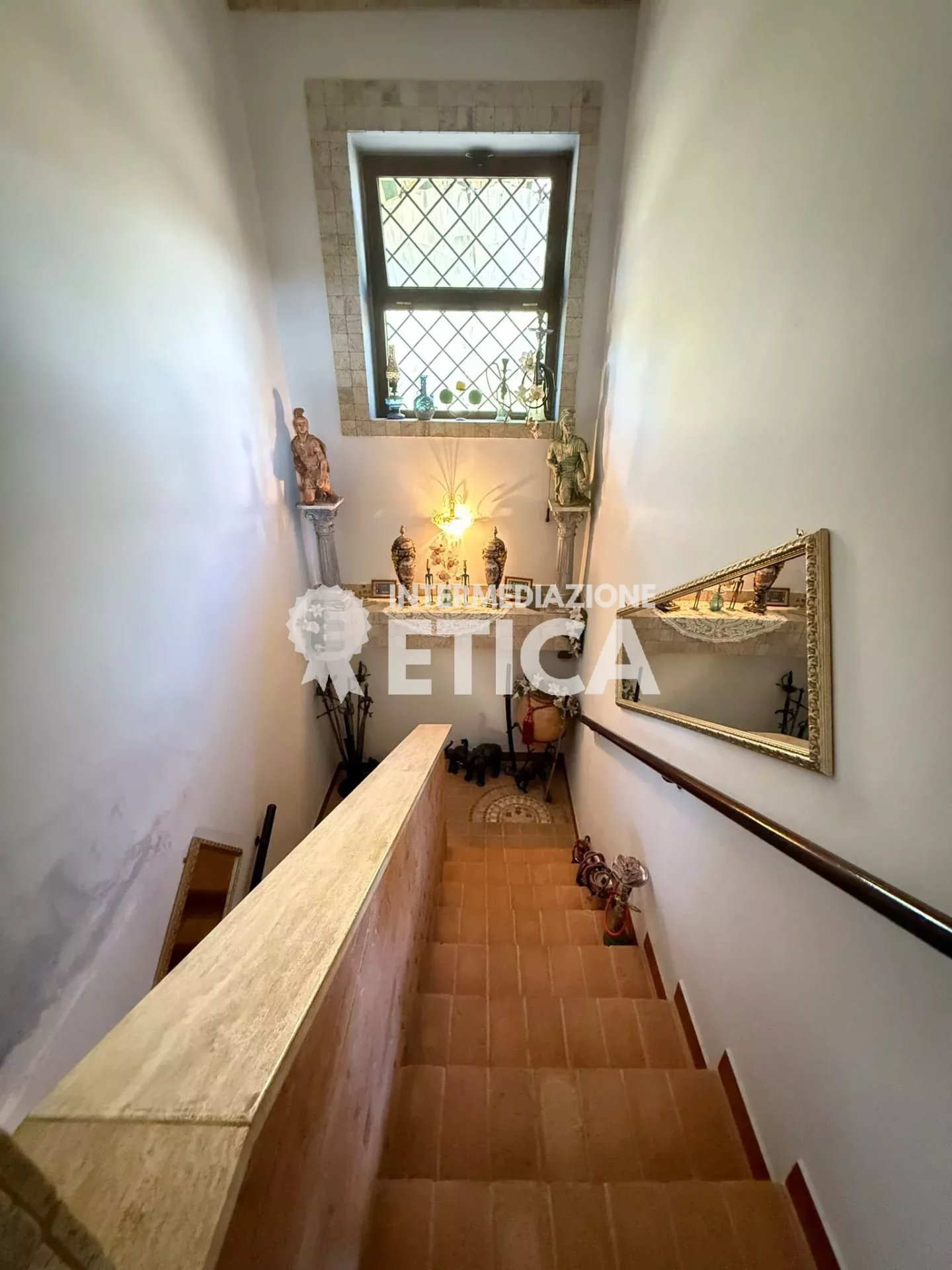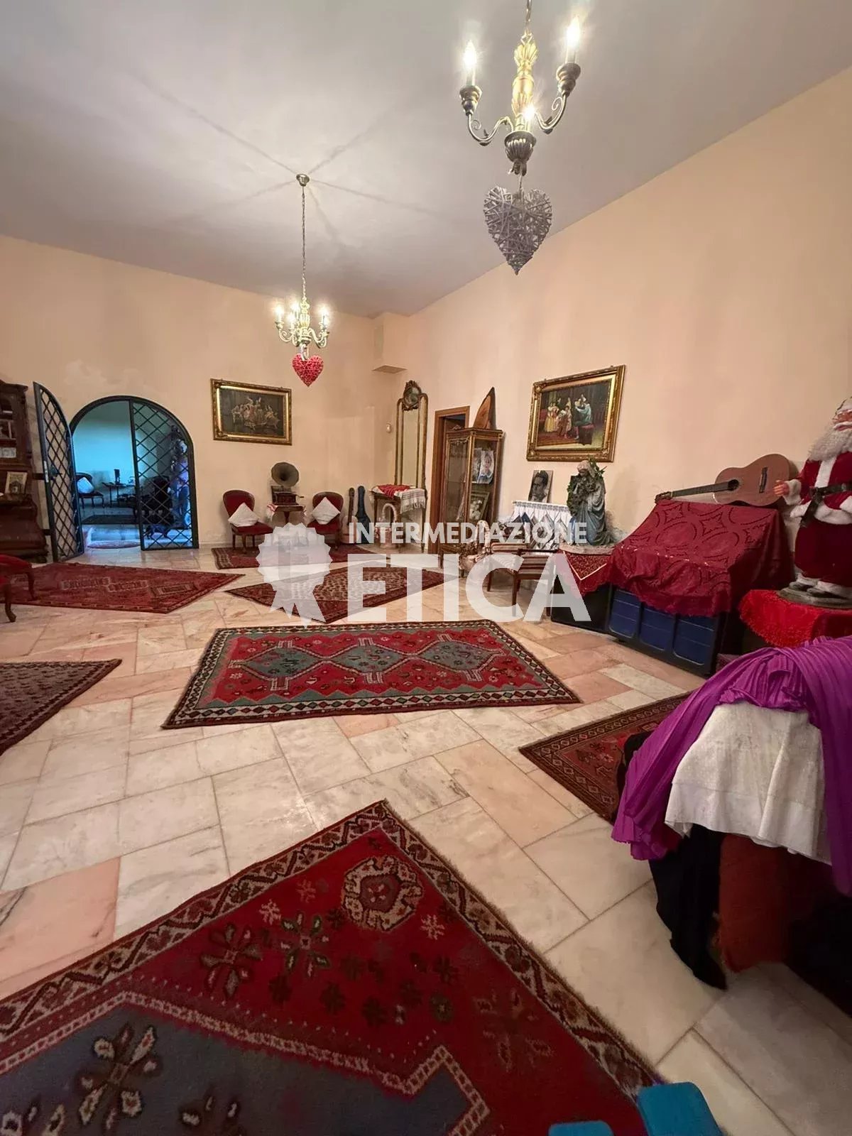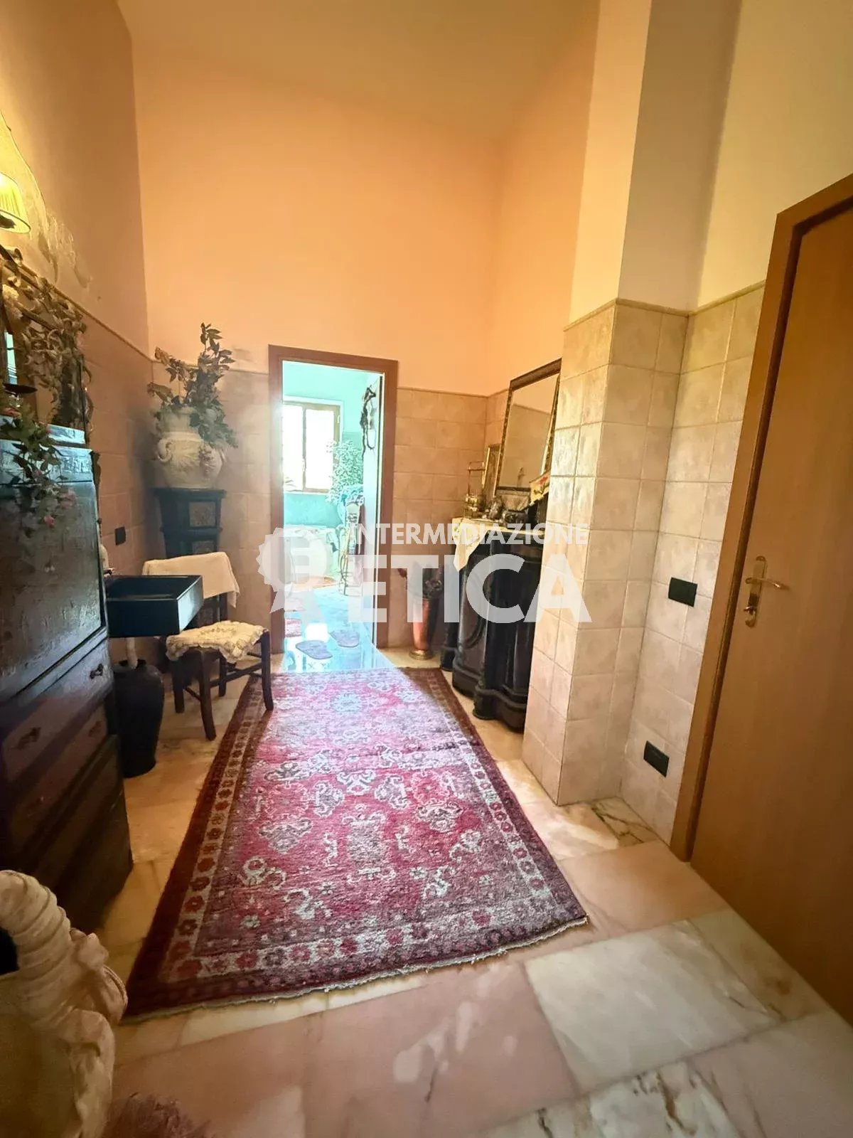 Scendendo le scale, al piano terra, dai soffitti alti, ci accoglie la sala per gli ospiti, con una imponente cucina in muratura, e a seguire, la sala ricevimenti, spaziosa ed eclettica, avendo solo le colonne portanti, darà a chiunque la possibilità di personalizzare gli spazi.